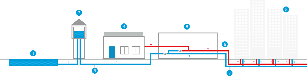 В централизованных системах выработка тепла производится на ТЭЦ, в различных котельных, используется также т. н. отбросное тепло промышленных предприятий, подземные и др. источники; при этом тепло передаётся к потребителям по трубопроводам теплосети. Приготовление горячей воды производится как в самих источниках тепла, так и в центральных тепловых пунктах (ЦТП) или же непосредственно в домах.