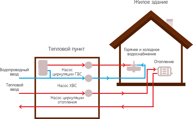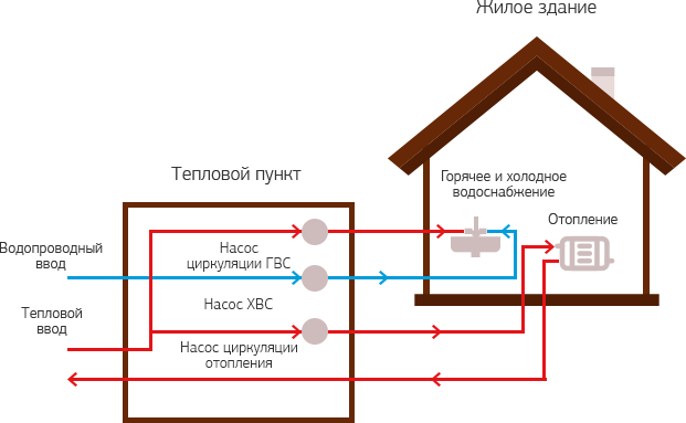 Открытая система ГВС. При осуществлении горячего водоснабжения по открытой схеме вода «разбирается» потребителями непосредственно из тепловой сети. При этом отпадает необходимость установки водонагревателей в домах или на ЦТП и уменьшается возможность коррозии местных трубопроводов. Однако для «подпитки» таких систем требуется большое количество воды, прошедшей предварительную обработку во избежание накипи и коррозии в трубах и оборудовании теплоснабжающих устройств. Максимальная температура воды в системах горячего водоснабжения 75°С, минимальная (в точках водоразбора) 60°C.