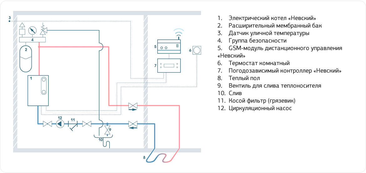 Схема котельной при работе электрокотла "Невский" с теплым полом