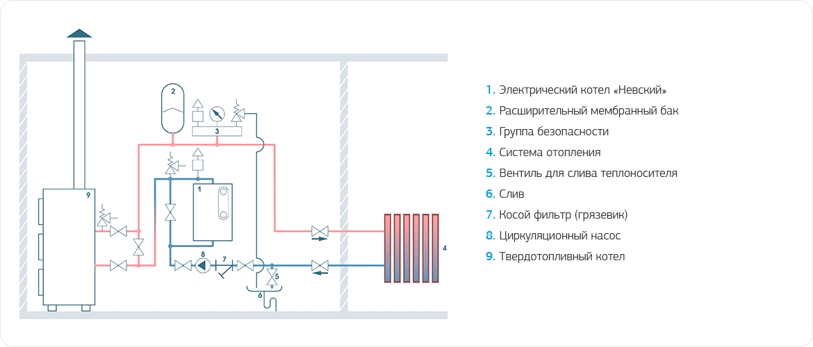 Электрокотел Невский можно использовать в качестве резервного при последовательном подключении с газовым или жидкотопливным котлом. При этом на терморегуляторе электрокотла Невский выставляется температура теплоносителя на 8-10° C ниже установленного на основном котле, а температура воздуха на компактном термостате электрокотла в помещении на 5° C ниже, чем установленная на комнатном термостате основного котла. Если по какой-либо причине основной котел (газовый или дизельный) остановится, и температура в помещении понизится – электрический котел автоматически включится, и будет поддерживать установленную на его терморегуляторе температуру помещения.