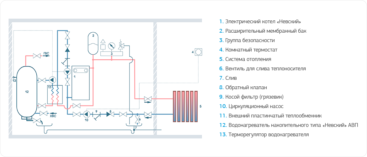 Схема подключения электрокотла в отопительную систему с водонагревателем накопительного типа с внутренним трубчатым теплообменником
