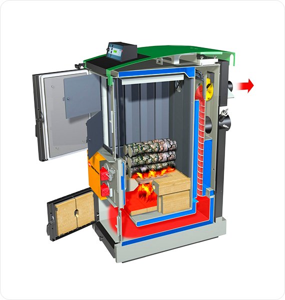 Пиролиз древесины осуществляется при температуре 1100°С. Причем процесс этот экзотермический, то есть идущий с выделением тепла, за счет чего улучшается прогрев и подсушивание топлива в котле, и происходит подогрев поступающего в зону горения воздуха. Смешение кислорода с выделившимся пиролизным газом при высокой температуре вызывает процесс горения последнего, который используется в дальнейшем для получения тепловой энергии. При этом следует отметить, что пиролизный газ в процессе сгорания взаимодействует с активным углеродом, в результате чего дымовые газы на выходе из котла практически не содержат вредных примесей, являясь, по большей части, смесью углекислого газа и водяного пара. И даже СО2 такой котел будет выбрасывать в атмосферу до 3-х раз меньше, чем обычный дровяной и, тем более, угольный котел.