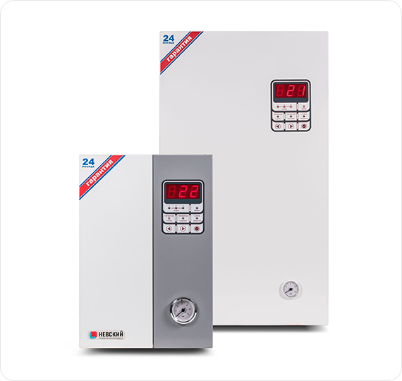 Для нагрева теплоносителя в электрокотлах ТЭНов может быть несколько. Мощность котла при этом является суммарной мощностью ТЭНов. Устанавливаются ТЭНы в специальном баке, называемом теплообменником. Имеется также блок управления с регулированием. В электрических котлах, как правило, используют патронные ТЭНы, т.е. одноконцевые, с контактными выводами расположенными по одну сторону нагревателя. Реже встречаются двухконцевые ТЭНы, у которых контактные выводы расположены с двух сторон. В качестве примера приведем устройство ТЭНового котла российской фирмы «Невский». Внутри емкости теплообменника размещаются один или несколько ТЭНов. Как правило, в качестве материала для емкости производители используют обычную углеродистую сталь, но некоторые предпочитают медь, нержавеющую сталь или другие материалы, обладающие повышенной коррозионной стойкостью. Мощность регулируется ступенчато, включением одного или нескольких ТЭНовых нагревателей. Пользователь при необходимости может принудительно задать максимальную мощность, в пределах которой котел может динамически менять потребление.