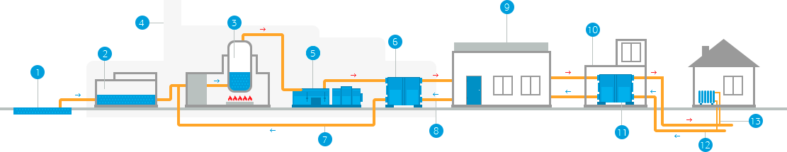 В деловых, жилых и промышленных районах городов умеренного и холодного климата экономически выгодно использовать тепло от централизованного источника тепла (ТЭЦ). В таких районах прокладывается сеть трубопроводов (тепловая сеть) и устанавливаются снабженные счетчиками распределительные тепловые пункты, которые снабжают индивидуальных потребителей паром или горячей водой.